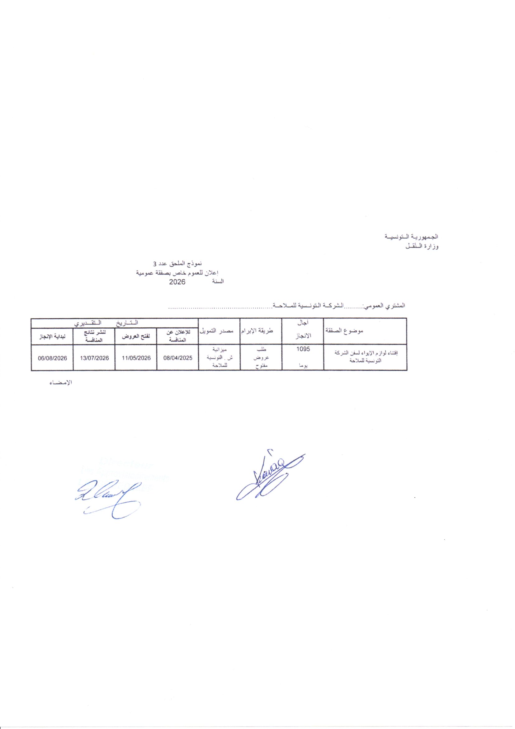 Appel d'offres N°02/2026 relatif à l'acquisition d'articles de literie, du linge de table et du linge d'éponge pour le compte des navires de la Compagnie tunisienne de Navigation".