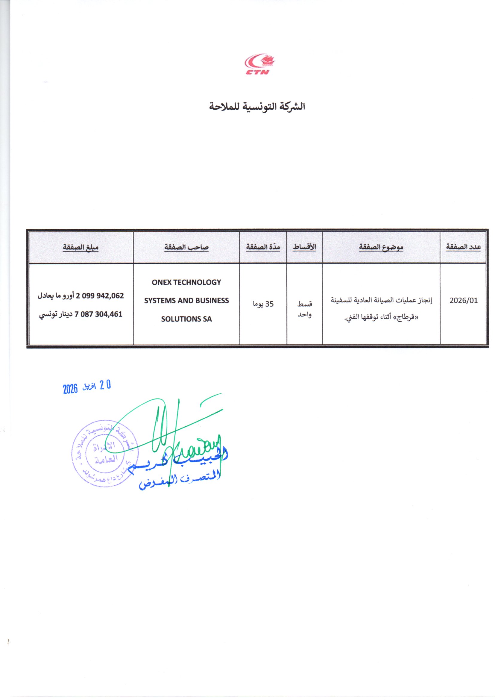 Résultat du marché N°01/2026 relatif à l'Exécution des travaux d'arrêt technique de visite normale du C/F CARTHAGE